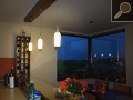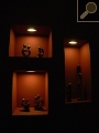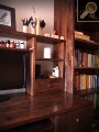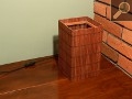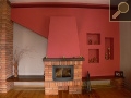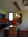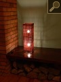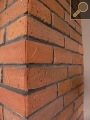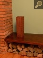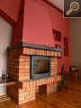 Kompleksowa zabudowa kominka. Bezpośrednia obudowa wkładu z gazobetonu. Czopuch, obudowa rury odprowadzającej spaliny oraz ścianka z wnękami wykonane zostały z płyty kartonowo−gipsowej. Po bokach dwie drewniane ławy. Całość wykończona ręcznie ciętymi płytkami z cegły oraz uzupełniona ozdobnym oświetleniem diodowym. Pod ławami duża przestrzeń na zapas drewna. Podświetlane wnęki przewidziane na barek z przeszkolonymi drzwiczkami osatecznie zostały w pierwotnej formie.