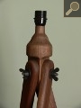 Lampa na bardzo specyficznym statywie, który z każdej strony prezentuje się inaczej i zdaje się nie zachowywać jakiejkolwiek regularności czy symetrii. Chrakterystyczny kształt, dwa kolory drewna, ekologiczny abażur wykonany z wytłoczek do przechowywania jaj, nietypowy sposób regulacji rozstawu nóg oraz ciekawe wykończenie i prowadzenie przewodu − wszystko to razem tworzy niezwykłą, niepowtarzalną formę, która na pewno przyciągnie uwagę niejednego obserwatora.