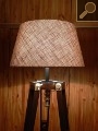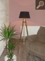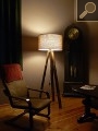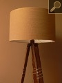 Elegancka lampa podłogowa na statywie z impregnowanego drewna w dwóch odcieniach. Duży, jutowy abażur oraz specjalnie dobrane do niego, ciekawe wykończenie przewodu zasilającego. Nogi z aluminiowymi zdobieniami tradycyjnie z regulowanym rozstawem. Lampa o takich gabarytach świetnie sprawdzi się w dużym, przestronnym salonie, ale odpowiednio ustawiona może również stanowić dominujący element wystroju mniejszego pomieszczenia.