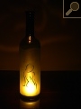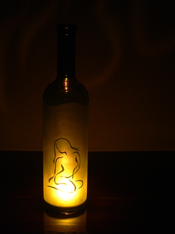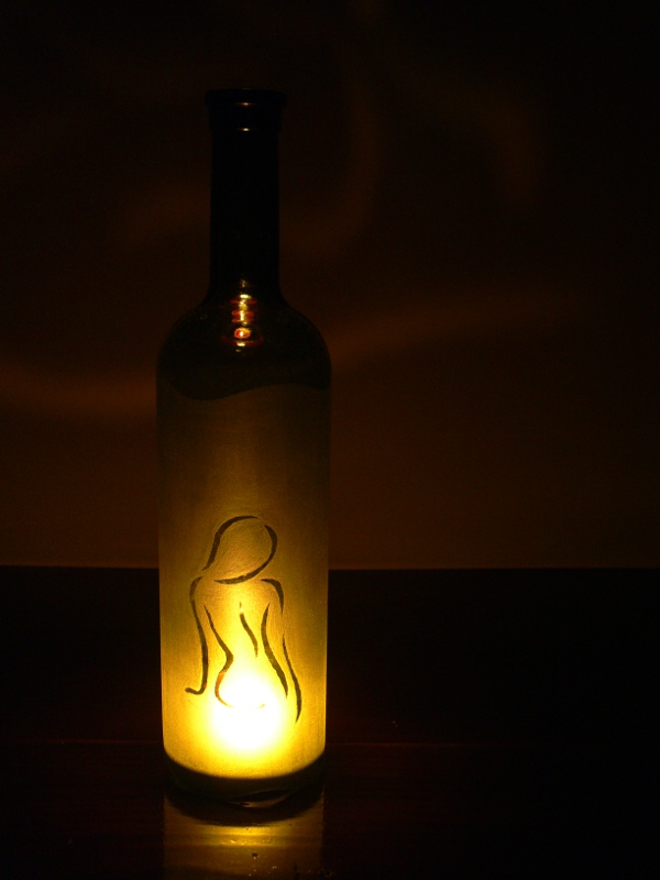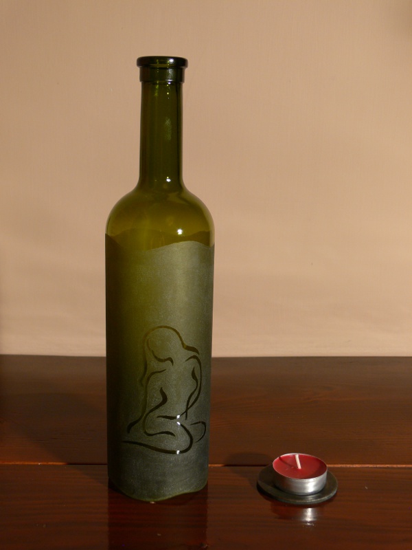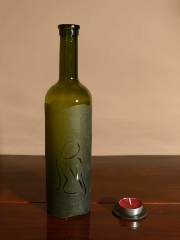 Świecznik wykonany z butelki po winie z grawerowanym, dwustronnym motywem kobiety. Będzie oryginalnym elementem wystroju wnętrza w restauracji, pubie, ale także w sypialni czy w salonie Waszego domu. Bardzo delikatne, nastrojowe światło nada każdemu wnętrzu spokojny, ciepły i romantyczny klimat. Motyw kobiety może zostać zastąpiony dowolnym wzorem według życzenia klienta. W komplecie metalowa, oksydowana podstawka pod świeczkę.