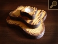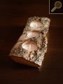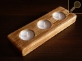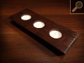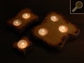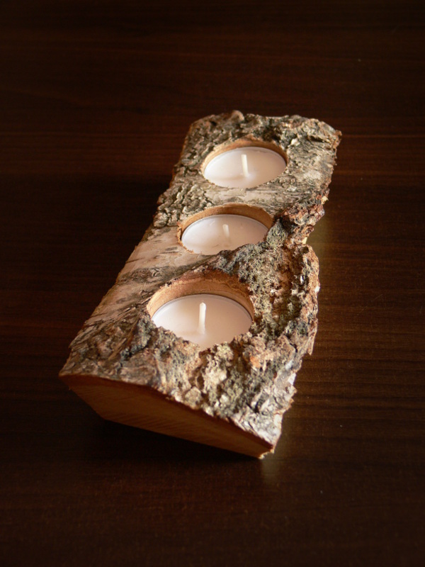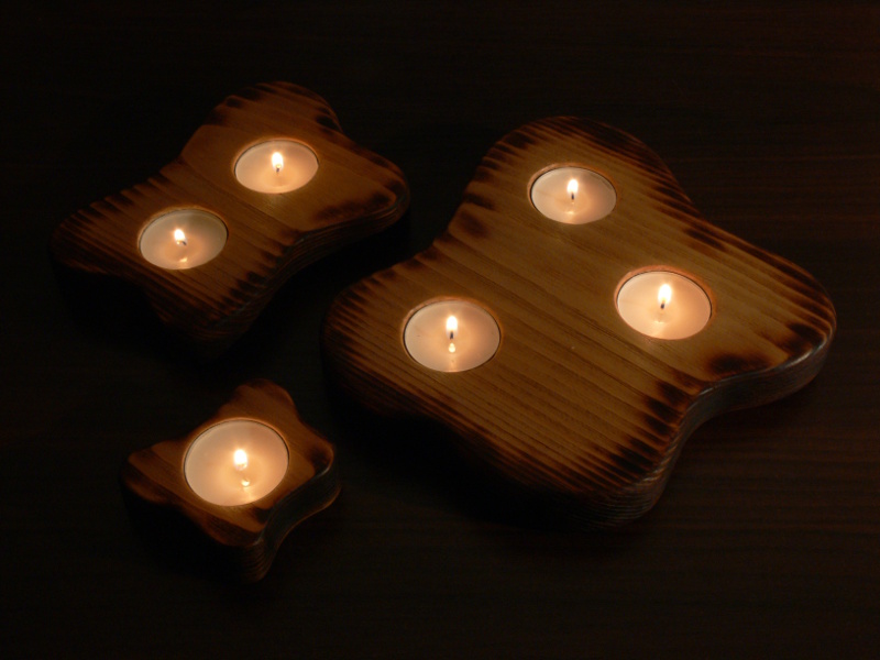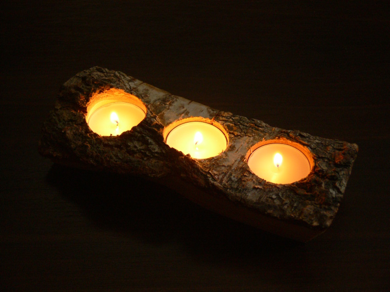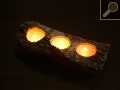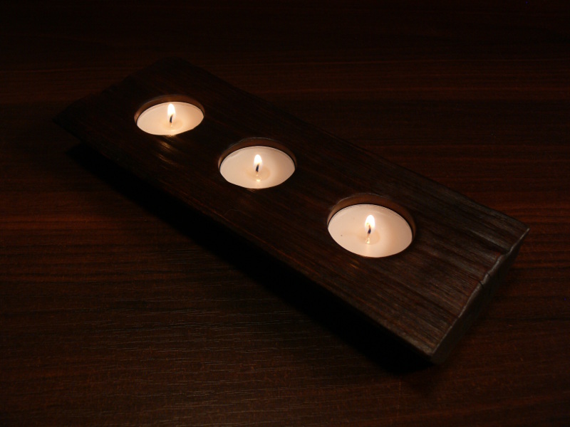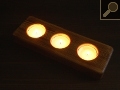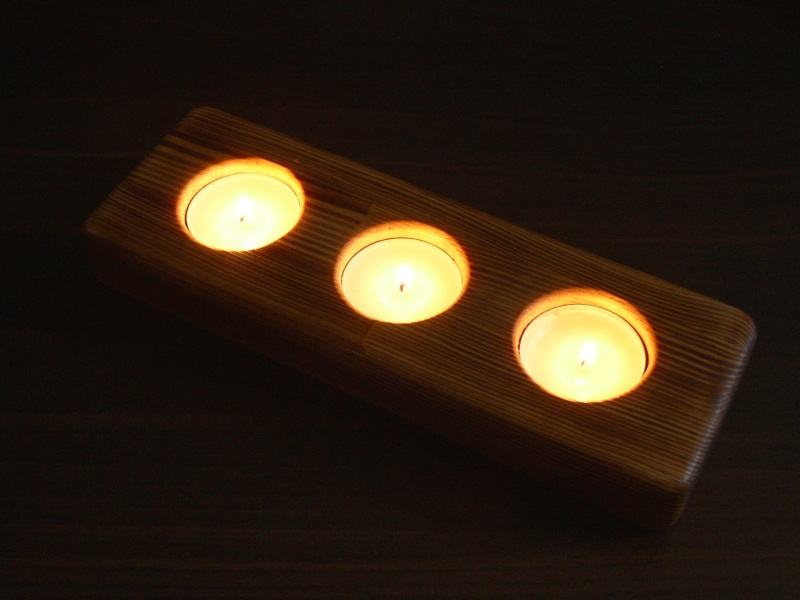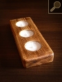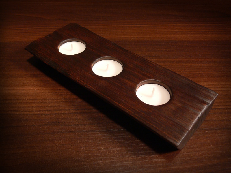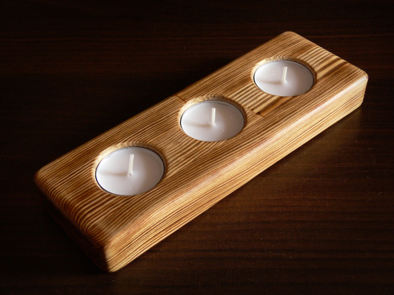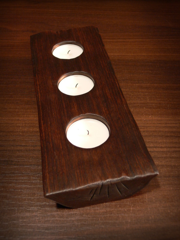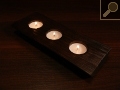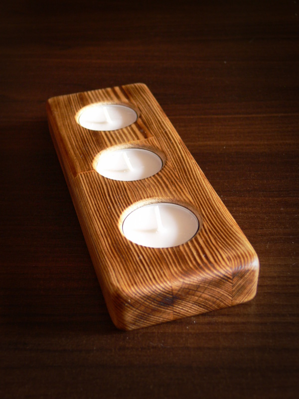 Świecznik potrójny − drewniana listwa. Drewno wykończone dającą bardzo ciekawy efekt techniką opalania, a następnie zabezpieczone olejem. Do świecznika dołączone są trzy metalowe podkładki przydatne przy stosowaniu niższych świeczek.
