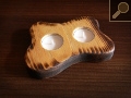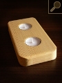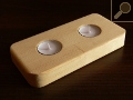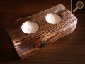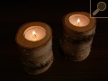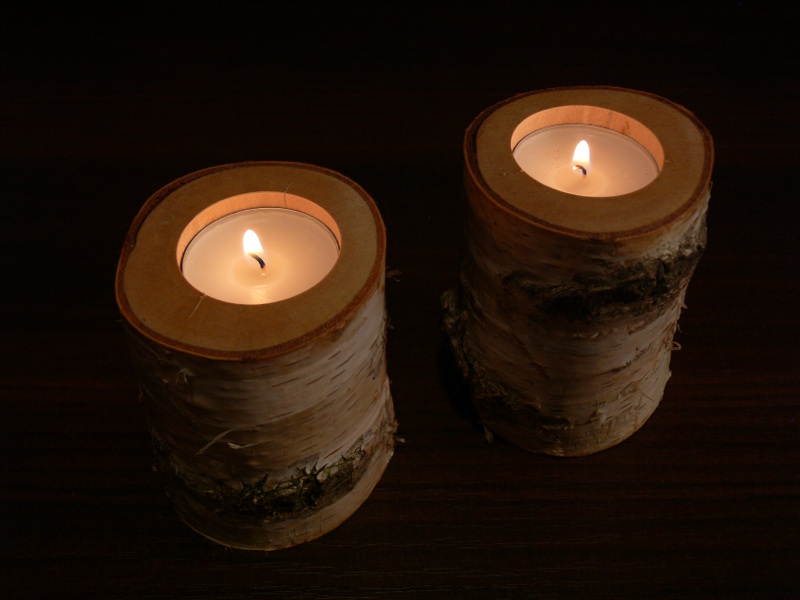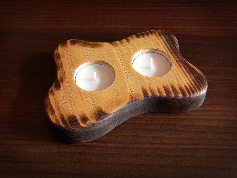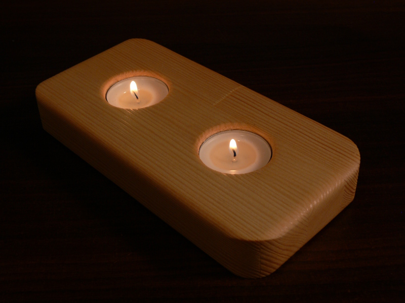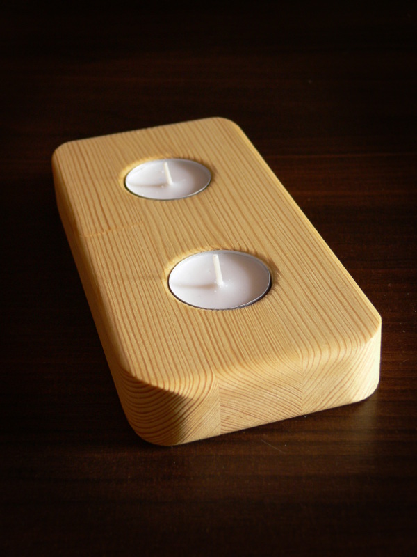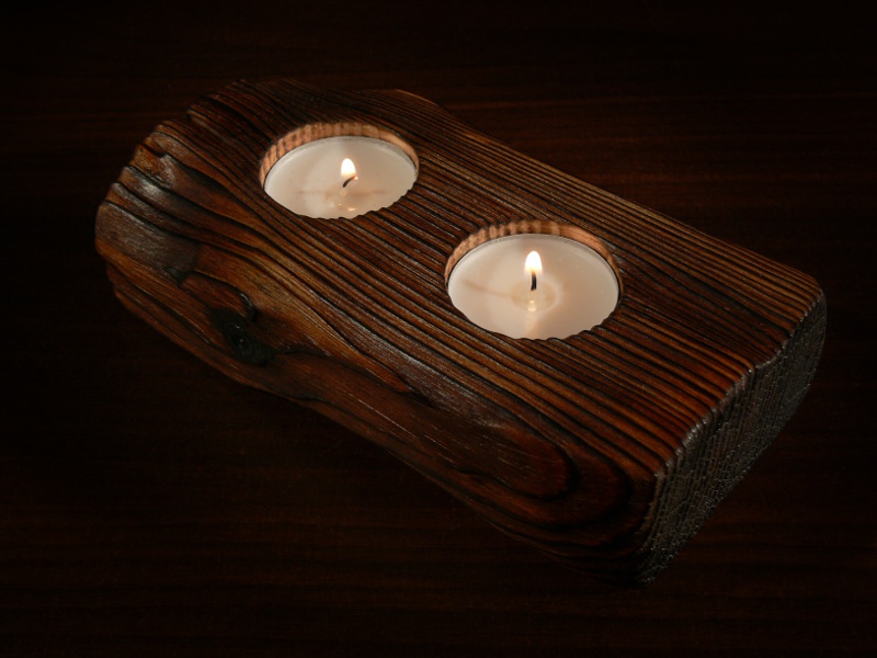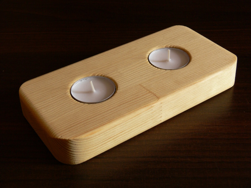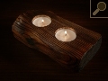 Świecznik drewniany − podwójny. Drewno sosnowe w naturalnym kolorze pokryte olejem. Do świecznika dołączone są dwie metalowe podkładki przydatne przy stosowaniu niższych świeczek.