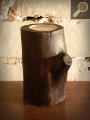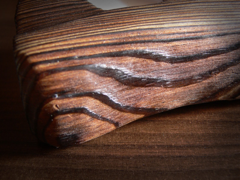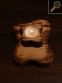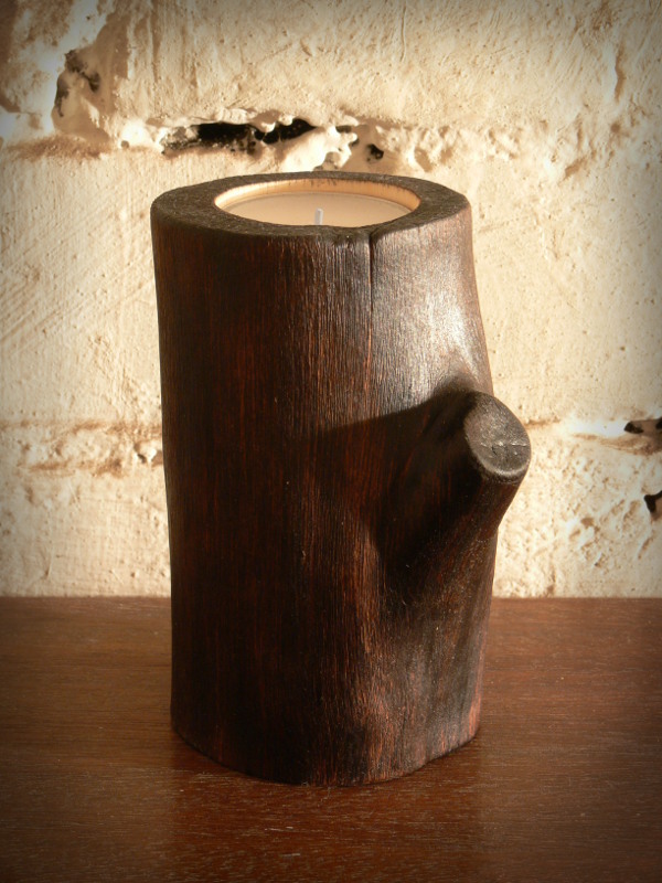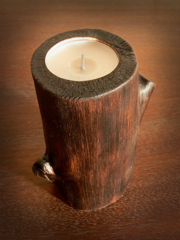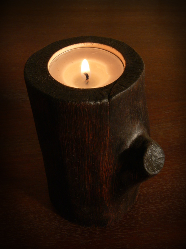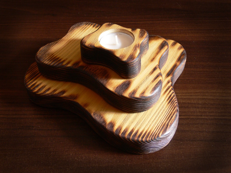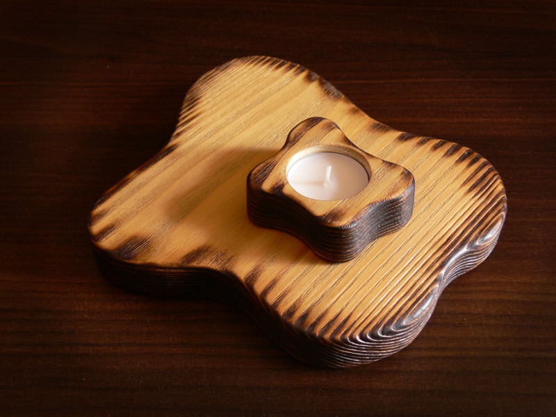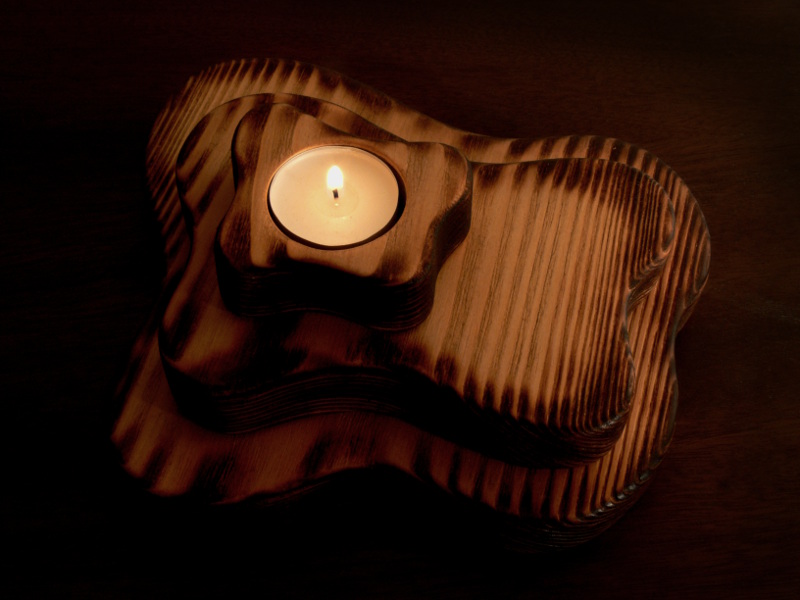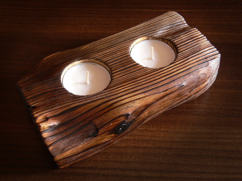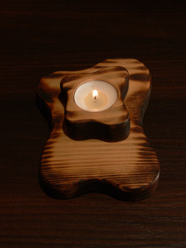 Podwójny świecznik wykonany z kawałka drewna sosnowego o nieregularnym kształcie z naturalnymi pęknięciami. Świecznik został wykończony ciekawą techniką opalania, która nadała rysunkowi drewna przestrzenny charakter. W ostatnim etapie świecznik został zabezpieczony specjalnym olejem. Do świecznika dołączone są dwie metalowe podkładki przydatne przy stosowaniu niższych świeczek.