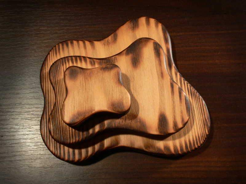 Trzyczęściowy zestaw drewnianych świeczników. Poszczególne elementy można ustawiać i obracać w różne konfiguracje tworząc z nich jeden, dwa lub trzy oddzielne świeczniki. Mogą one również stanowić jedynie ciekawą drewnianą formę ukrywającą swoje praktyczne zastosowanie. Drewno opalane, a następnie olejowane. Komplet zawiera również sześć metalowych podkładek przydatnych przy stosowaniu niższych świeczek.