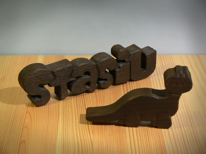 Napis z litego drewna, imię Twojej pociechy − Stasiu oraz figurka dinozaura. Estetyczna i ekologiczna dekoracja nadająca się zarówno do powieszenia na ścianie, jak i do postawienia na półce albo biurku. Dziecinna czcionka i bardzo sympatyczny dinozaur świetnie wkomponują się w klimat pokoju Twojego malucha. Zarówno napis jak i figurka zostały wykonane ręcznie z jednego kawałka drewna bukowego oraz wykończone poprzez opalenie. Jeśli chcesz, drewno może zostać pokryte specjalnym olejem lub lakierem.