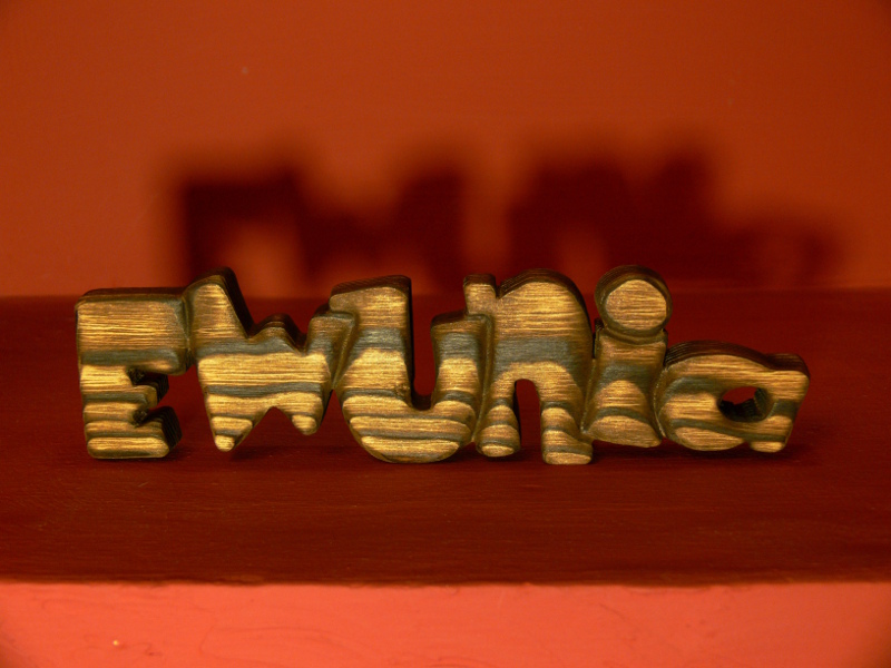 Ręcznie wykonany napis z litego drewna − imię Twojej pociechy − Ewunia. Estetyczna i ekologiczna dekoracja nadająca się zarówno do powieszenia na drzwiach lub ścianie, jak i do postawienia na półce albo biurku. Sympatyczna, dziecinna czcionka świetnie wkomponuje się w klimat pokoju Twojego malucha. Napis został wykonany z jednego kawałka drewna sosnowego i wykończony poprzez opalenie. Na życzenie klienta może zostać pokryty specjalnym olejem lub lakierem. Może również być zabarwiony na wybrany kolor.