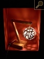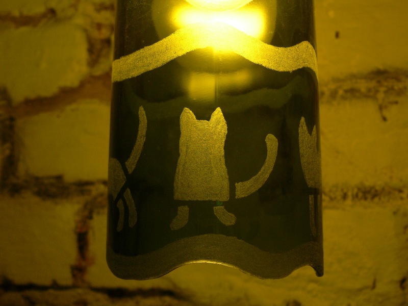 Ekologiczna lampa wykonana z butelki po winie. Podsufitka zrobiona została z odciętego od butelki denka. Lampa może stanowić niezwykle oryginalny element wystroju wnętrza w restauracji, pubie, ale także w ciekawie i odważnie urządzonym mieszkaniu. Grawerowany "koci motyw" może zostać zastąpiony dowolnym wzorem dobranym według życzenie klienta. Istnieje również możliwość wykonania świecznika z takim samym grawerem.