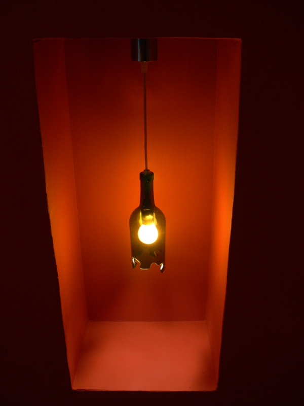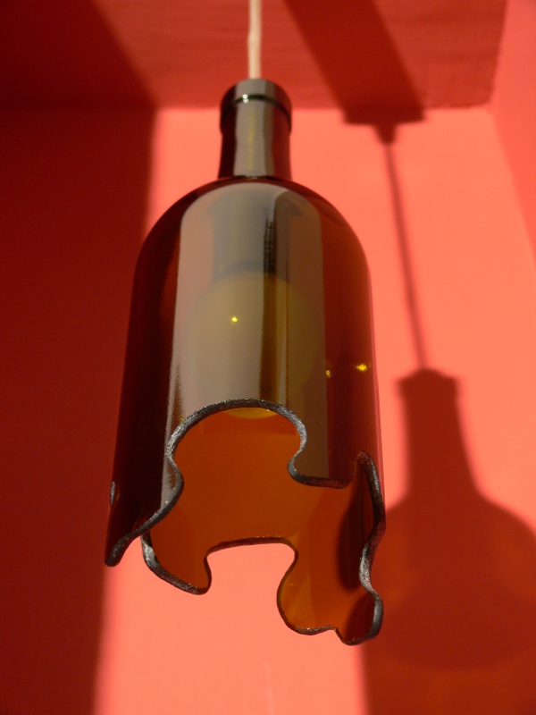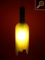 Ekologiczna lampa wisząca wykonana z butelki po winie z podsufitką ze stali nierdzewnej. Fantazyjna linia cięcia powoduje, że wszelkie dodatkowe zdobienia stają się absolutnie zbędne. Lampa może stanowić niezwykle oryginalny element wystroju wnętrza w restauracji, pubie, ale także w ciekawie i odważnie urządzonym mieszkaniu.