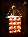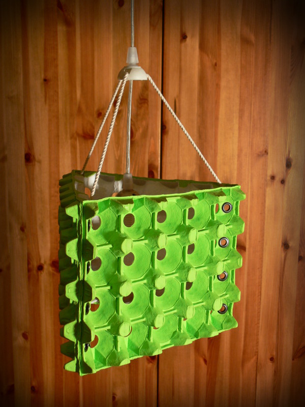 Lampa na prostej podstawie wykonanej z impregnowanego drewna, z niezwykle oryginalnym, ekologicznym abażurem, do zrobienia którego wykorzystano wytłoczki do przechowywania jaj. Daje bardzo ciekawe, ozdobne światło. Świetnie nadaje się do postawienia na niskim meblu czy wiszącej na ścianie półce.
