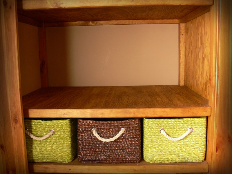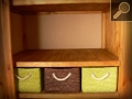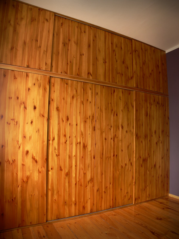 Szafa wnękowa czyli niezwykle praktyczny mebel, który pomieści prawie wszystko, a zarazem estetyczny element wystroju wnętrza bardzo ocieplający jego klimat. Drzwi przesuwne, podłoga części górnej oraz rama zostały wykonane z drewna, półki i ścianki w części dolnej ze sklejki. Dolny środkowy segment przeznaczony na wieszaki − dwa poziomy na rzeczy krótkie, jeden na rzeczy długie. W bocznych segmentach na dole półki, których układ można w łatwy sposób dostosować do własnych potrzeb. Część górna − pawlacz − nie został podzielony ściankami, dzięki czemu pomieści naprawdę duże przedmioty.