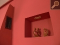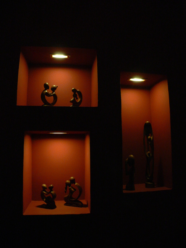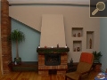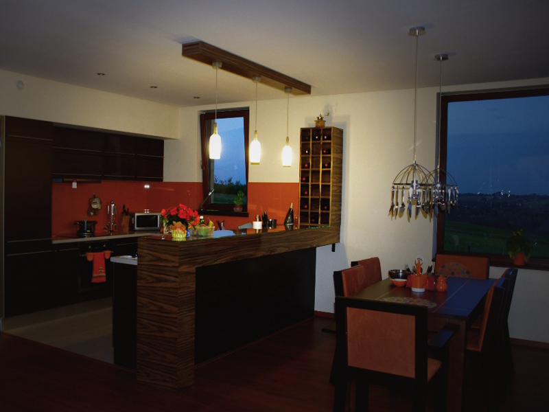Kompleksowa zabudowa kominka. Bezpośrednia obudowa wkładu z gazobetonu. Czopuch, obudowa rury odprowadzającej spaliny oraz ścianka z wnękami wykonane zostały z płyty kartonowo−gipsowej. Po bokach dwie drewniane ławy. Całość wykończona ręcznie ciętymi płytkami z cegły oraz uzupełniona ozdobnym oświetleniem diodowym. Pod ławami duża przestrzeń na zapas drewna. Podświetlane wnęki przewidziane na barek z przeszkolonymi drzwiczkami osatecznie zostały w pierwotnej formie.