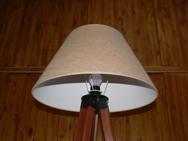 Elegancka lampa podłogowa na statywie z impregnowanego drewna w dwóch odcieniach. Duży, jutowy abażur oraz specjalnie dobrane do niego, ciekawe wykończenie przewodu zasilającego. Nogi z aluminiowymi zdobieniami tradycyjnie z regulowanym rozstawem. Lampa o takich gabarytach świetnie sprawdzi się w dużym, przestronnym salonie, ale odpowiednio ustawiona może również stanowić dominujący element wystroju mniejszego pomieszczenia.