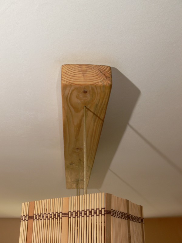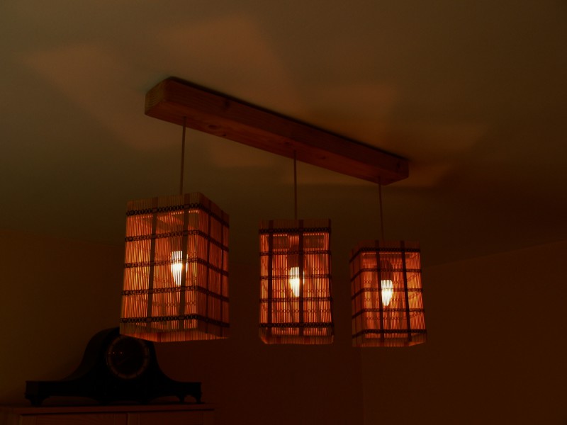 Lampa sufitowa wykonana na zmaówienie do pokoju, w którym króluje drewno − podłoga z sosnowych desek, tradycyjne sosnowe meble, drewninane drzwi oraz okna. Lampę charakteryzuje elegancja, a zarazem prostota, żadnych zbędnych zdobień i dodatków, drewniana konstrukcja oraz słomkowo bambusowe abażury dające przytulne, miękkie światło − to wszystko świetnie wkomponowuje się w klimat pomieszczenia.