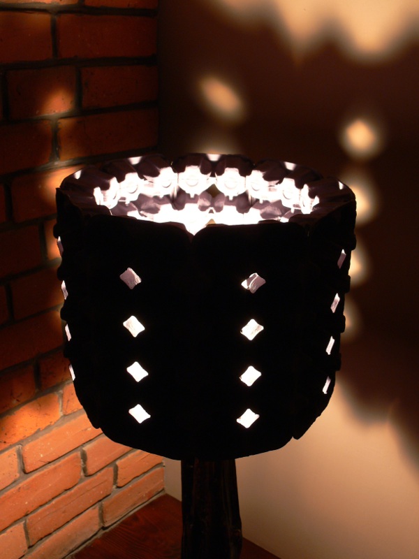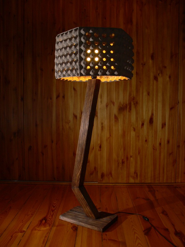 Lampa podłogowa o niezwykle oryginalnym kształcie. Podstawa wykonana z opalanego i impregnowanego drewna pozbawiona jest gładkich powierzchni i równych krawędzi, co nadaje lampie surowy, ale zarazem bardzo ciepły charakter. Abażur wykonany z wytłoczek do przechowywaniach jaj, z pewnością przyciągnie uwagę nie tylko zapalonych ekologów, ale także miłośników ciekawej, niespotykanej nigdzie indziej, formy.