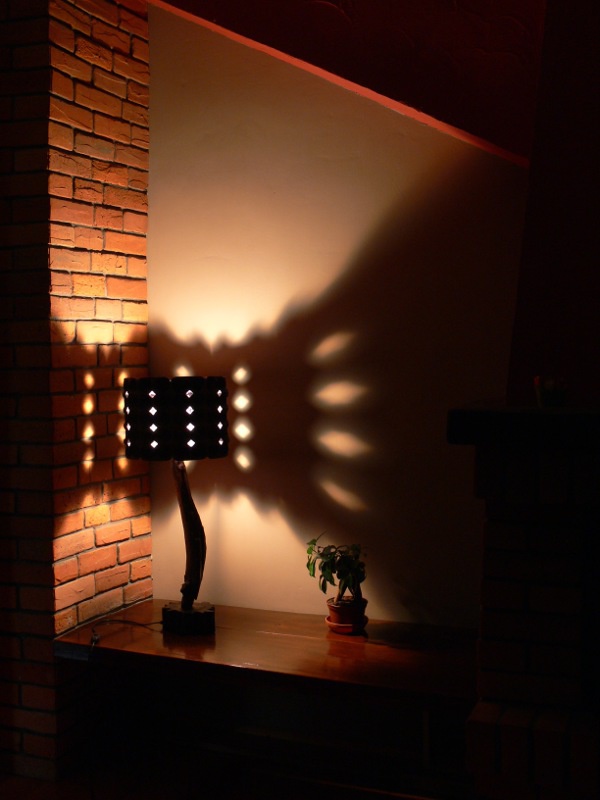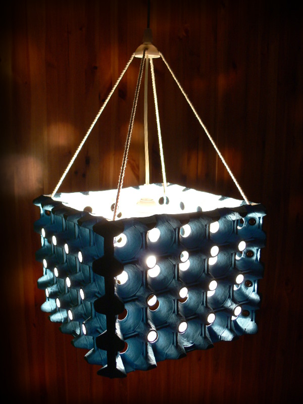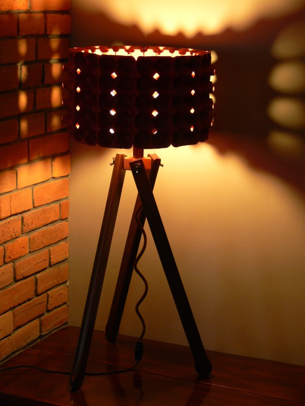 Oto przepis na wyjątkową lampę − wyjątkowy, ekologiczny abażur wykonany z wytłoczek do przechowywania jaj oraz wyjątkowa podstawa o ciekawym kształcie, wykonana z opalanego drewna. Technika wykończenia podstawy nadaje rysunkowi drewna przestrzenny charakter, co przy włączonej lampie prezentuje się niezwykle pięknie.