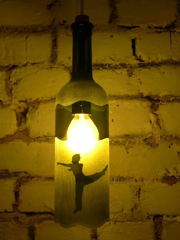 Ekologiczna lampa wisząca wykonana z butelki po winie. Podsufitka zrobiona została z odciętego od butelki denka. Lampa może stanowić niezwykle oryginalny element wystroju wnętrza w restauracji, pubie, ale także w ciekawie i odważnie urządzonym mieszkaniu. Grawerowany motyw tancerzy może zostać zastąpiony dowolnym wzorem dobranym według życzenie klienta. Istnieje również możliwość wykonania świecznika z takim samym grawerem.