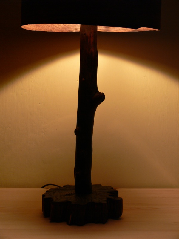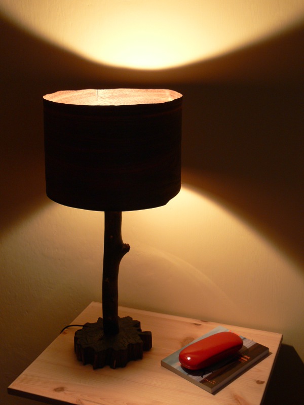 Podstawa tej lampy podobnie jak jej poprzedniczki wykonana została z dwóch surowych kawałków drewna brzozowego, opalonych, a następnie pokrytych specjalnym olejem. Abażur tym razem nie z papieru, a z jego pierwotnej formy czyli... z drewna. Na zewnątrz naturalny fornir z orzecha amerykańskiego, w środku drewniana ramka. Nieregularne krawędzie, również delikatnie opalone tak, aby abażur pasował do podstawy. Lampa prezentuje się bardzo elegancko, zachowując jednocześnie swój surowy, naturalny i niepowtarzalny charakter.