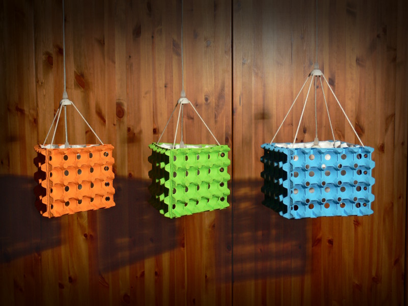 Nowa seria wiszących lamp papierowych wykonanych z wytłoczek do przechowywania jaj. Tym razem nasze ekologiczne abażury są w centrum uwagi i to one grają główną rolę. Odważne, intensywne kolory, ciekawe kształty, a zarazem prosta konstrukcja. Papierowe elementy połączone zostały metalowymi oczkami, które stanowią jednocześnie ciekawy element ozdobny. Te lampy z pewnością ożywią i rozweselą każde wnętrze oraz nadadzą mu niepowtarzalnego charakteru. W przypadku realizacji na zamówienie istnieje możliwość dobrania koloru, ilości i układu otworów w bocznych ściankach oraz długości przewodu.