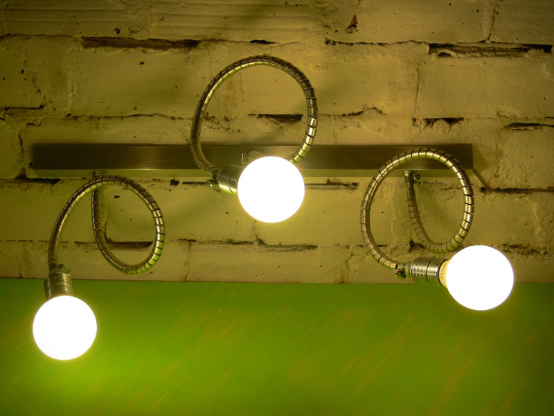 Tym razem potrójna lampa na aluminiowej listwie mocowanej do sufitu. Tradycyjne metalowe oprawki z ceramicznym wkładem zainstalowane są na spiralnych aluminiowych ramionach. Poza tym bark kloszy, abażurów i tym podobnych zbędnych dodatków :) Estetyczne żarówki doskonale dopełniają całości. Beton, cegła, szkło, no i oczywiście wszelkiego rodzaju inna stal − to towarzystwo, w którym ta lampa świetnie się odnajdzie.