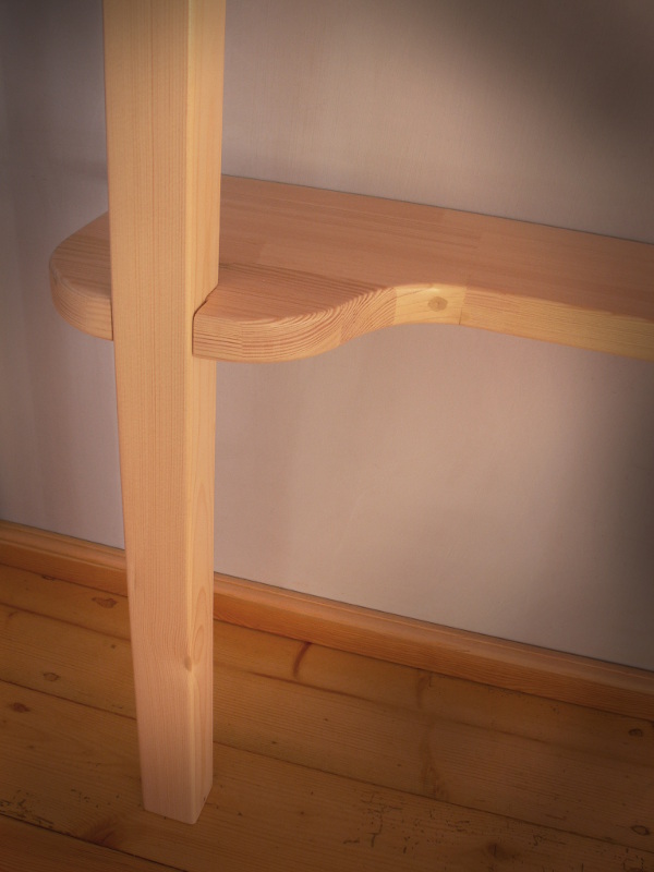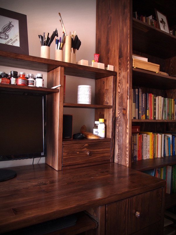 Drugi element kompletu stanowi regał − biblioteczka. Dwie stałe półki oraz trzy z możliwością dopasowania wysokości. Tylna ścianka wykonana ze sklejki.