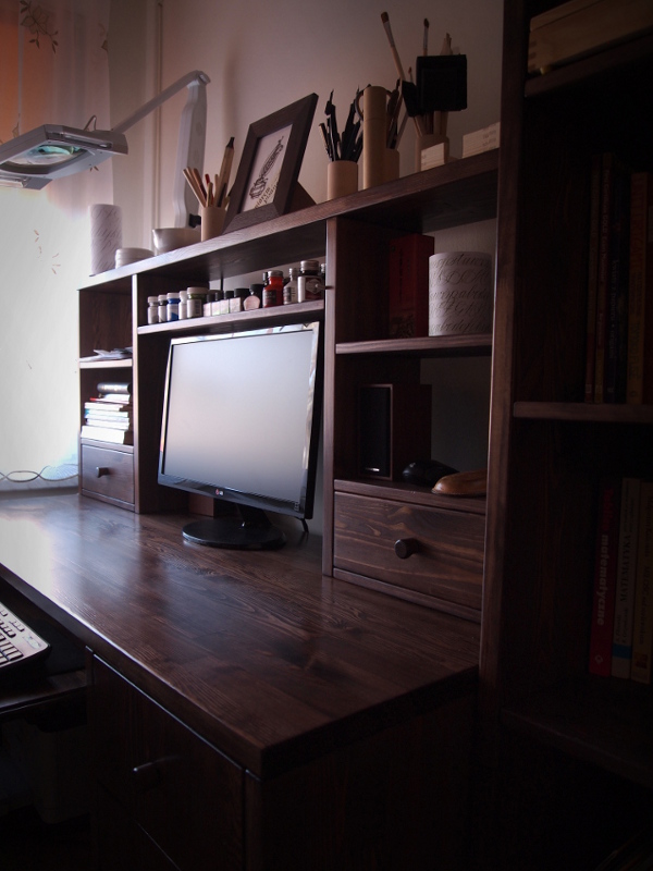 Główny element zestawu to stanowisko pracy w postaci biurka z nadstawką oraz dodatkowym podświetlanym blatem. Biurko posiada półkę na komputer, szafkę, dużą szufladę oraz wysuwaną półkę na klawiaturę. Nadstawka z miejscem na monitor, półeczkami i dwiema małymi szufladkami. Dodatkowy blat posiada podświetlenie diodowe, a także regulowany aż w sześciu położeniach kąt nachylenia. Przykryty jest szkłem, pod którym znajduję się warstwa pleksi odpowiednio rozpraszającego światło.